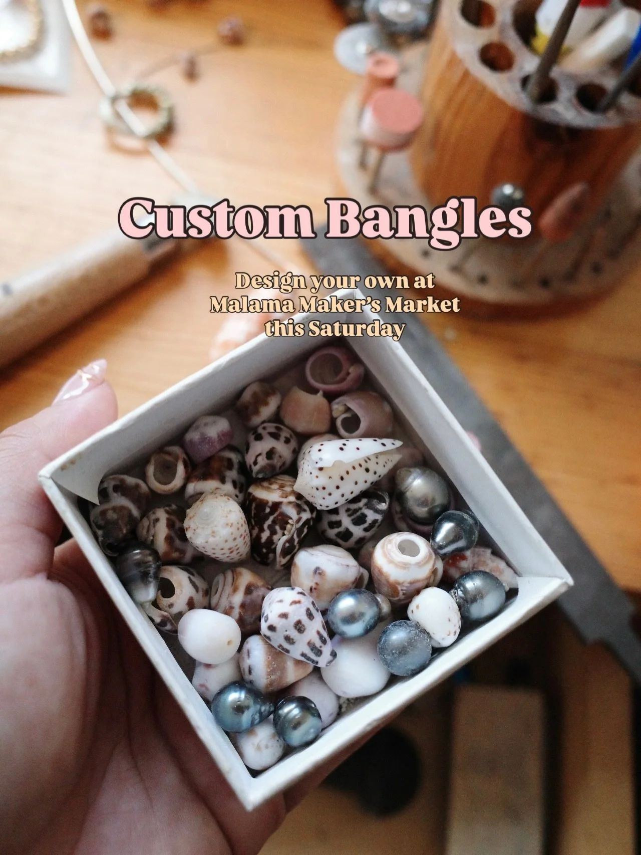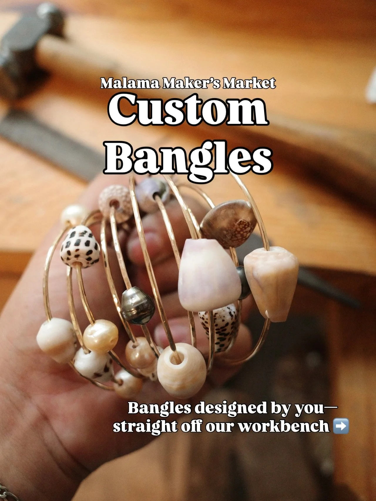 Pick out your own shells, glass, and pearls for a completely unique bangle making experience. No premade bangles here!